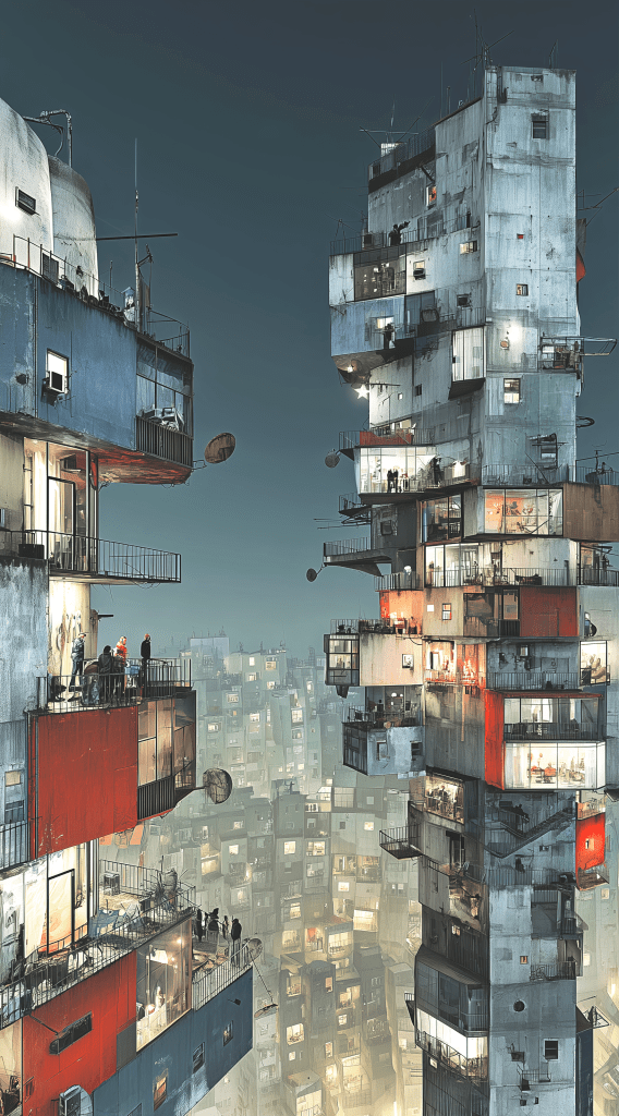 Here, nothing hums but the night. There are no drones, no perfect grids, no silent automation. Only voices, only footsteps on staircases welded in secret, only stories that keep stacking on top of one another.